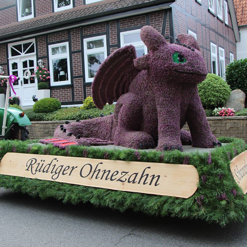 Ist das Heideblütenfest erst einmal am Lopausee eröffnet, geht es in die Heiße Phase des Wagenbaus. Täglich wird frische Heide in der Umgebung geschnitten und nach weiteren natürlichen Materialien zur Verwendung Ausschau gehalten. In der Scheune geht es dann weiter, dort wird die geschnittene Heide zu kleinen Sträußchen weiterverarbeitet. Diese werden dann einzeln mit sehr viel Aufwand an das Motiv gesteckt. Diese Arbeit erfordert viel Zeit, Durchhaltevermögen und natürlich Geschick. Teilweise werden auch noch weitere Bereiche gesteckt. Der Spaß und die Lust am gemeinsamen Gestalten ist ein ganz wichtiger Faktor für uns. So wird abends auch gemeinsam gegessen und beim Arbeiten viel geschnackt und geblödelt. Um den Umzug im Besonderen genießen zu können, gehen wir als Gruppe sehr gern hinter unserem Festwagen her. Hierbei sind wir passend zum Motiv gekleidet. Diese Kostüme werden von uns angefertigt, oder auch geliehen, ja nach Motiv und Aufwand. Am Festsonntag erfolgen dann die letzten Vorbereitungen zur Teilnahme am Umzug und die Nervosität steigt. Beim Umzug selbst, ist es sehr schön die Reaktionen der Gäste auf unser geschaffenes Motiv und uns als Gruppe erleben zu dürfen und dabei zu feiern. Nach dem Umzug steigt dann die Spannung zu der Bekanntgabe der Platzierungen der einzelnen Festwagen, die mal so oder so für uns ausfällt.