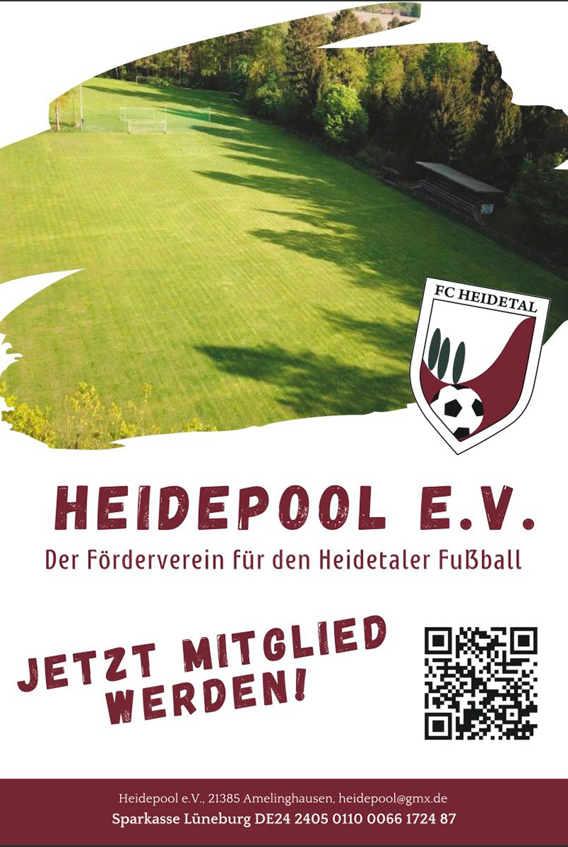 Am Donnerstag, dem 26.09., fand die Gründungsversammlung des Fördervereins für den FC Heidetal statt. Nach Eintragung in das Vereinsregister wird der Förderverein zukünftig Heidepool e.V. heißen. Ziel des Vereins wird es sein, den FC Heidetal finanziell und ideell zu unterstützen. Bei Interesse einer Mitgliedschaft steht der Vorstand jederzeit für Rücksprachen zur Verfügung. Erreichbar ist der Verein zudem unter Diese E-Mail-Adresse ist vor Spambots geschützt! Zur Anzeige muss JavaScript eingeschaltet sein.. Wir freuen uns...
