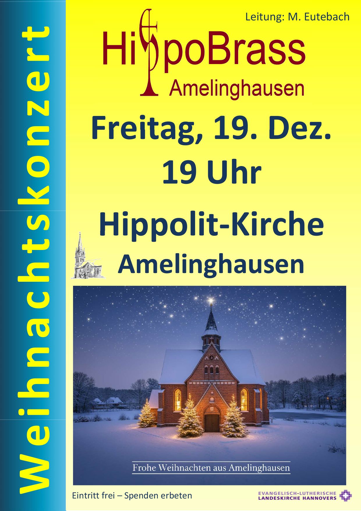 HippoBrass lädt Sie herzlich einAm Freitag, den 19.12.2025, um 19 Uhr, findet in der Hippolit Kirche in Amelinghausen das Weihnachtskonzert von HippoBrass statt. Wir präsentieren festliche Klänge und bekannte Melodien aus Tradition und Film. Das Konzert ist eine gute Wahl für Familien, Freunde und alle, die die Adventszeit mit Musik genießen möchten.Mit Werken von Johann Sebastian Bach, Georg Friedrich Händel und John Williams spannen wir einen Bogen vom Barock bis in die Gegenwart. Ergänzt wird das Programm durch Stücke, die von Michael Eutebach für uns bearbeitet wurden.