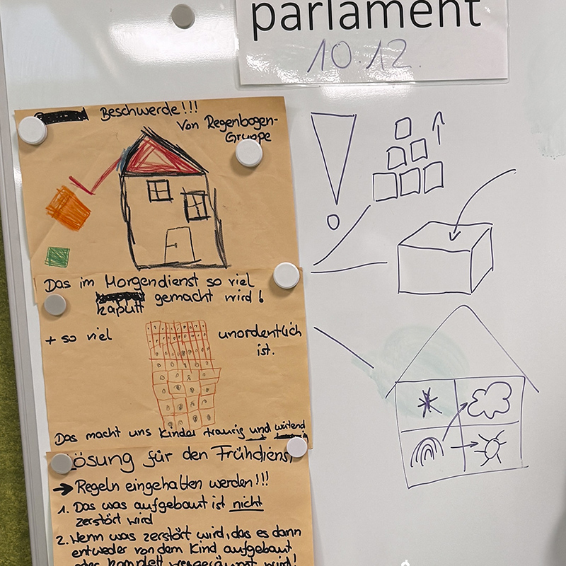 Dabei blieb es nicht bei Kritik: Die Kinder brachten mehrere konstruktive Vorschläge ein, wie der Frühdienst gerechter organisiert werden könnte. In einem gemeinsamen Prozess im Rahmen des Kinderparlaments wurde beschlossen, den Frühdienst künftig regelmäßig rollierend in unterschiedlichen Gruppenräumen stattfinden zu lassen. Des Weiteren stellten die Kinder Regeln auf: Wenn etwas kaputtgemacht wird, muss es entweder wieder aufgebaut oder zumindest aufgeräumt werden. Außerdem soll am Ende der Frühdienstzeit immer eine kleine Aufräumzeit stattfinden.