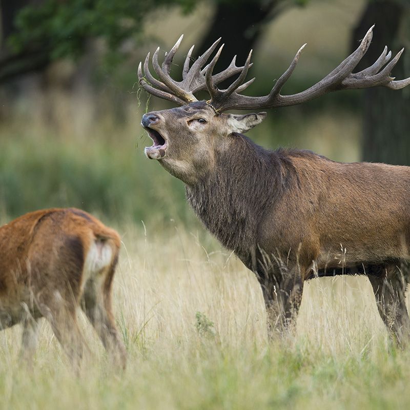 Die Rotwildbrunft ist ein ganz besonderes Schauspiel im September, sie ist laut und voller Kraft. Die Könige des Waldes, zum Teil über 200 Kilogramm schwer, mit Brunftmähne und riesigen Geweihen, schreien jetzt wieder. Die Rufe, die wirklich wie überdimensionales Rülpsen klingen, markieren den Besitzanspruch des Platzhirsches über sein Rudel weiblicher Hirsche – Kahlwild in der Jägersprache. Das ist auch bitter nötig, denn es gibt immer einige, meist jüngere Beihirsche, die ihm diesen Besitz streitig machen möchten und versuchen, ihm einige seiner Damen abzuwerben. Der Platzhirsch ist deshalb ständig unterwegs, um weibliche Tiere, die sich vom Rudel entfernen, wieder zurückzutreiben.