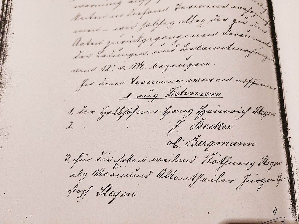 Der wohl vermögende Begas soll unter dem falschen Namen Justinus Becker 1851 einen Hof in Dehnsen gekauft und im April 1851 eine Bachmann‘sche Tochter geheiratet haben. Bis heute wird dieser Hof in der Brahms-Forschung gesucht. Dieses Rätzel kann anhand des Dehnsener Verkoppelungsrezesses vom 10. Dezember 1852 gelöst werden, denn für den Hof Bergmann, der in früheren Zeiten auch Bargmann genannt wurde, leistete Justinus Becker seine Unterschrift unter den Verkoppelungsrezess mit der Ergänzung olim (vormals) Bergmann. Bild vom Vertrag mit der Unterschrift von J. Becker Die Bachmann‘sche Tochter, die er geheiratet haben soll, war eine Tochter des Hofbesitzers Bergmann.