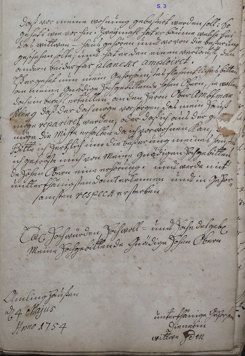 „Nun habe ich leider wider ein gantzes jahr mich so elendt in den elenden und gefehrlichen feuer Hütten, da ich keine nacht sicher auff meinem bette kan ohne große Sorge wegen feuers bunst zurück geleget, es wohnet kein betler so schlecht in dießer gemeine wie ich wohne es dauert dießer mein hülfloser zustandt schon ins 17.jahr“.