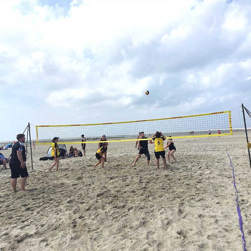 Am nächsten Morgen wurde ab 11:30 Uhr am schönen Strand von Borkum Volleyball gespielt. Bei strahlender Sonne gab es gute Ballwechsel und ausgelassene Gespräche mit anderen Teams. Das Bad in der Nordsee sorgte danach für eine willkommene Abkühlung. Nach einer Dusche war der Sand beim Essen kurz vergessen, bevor es wieder ins sandige Partyzelt ging. Rechtzeitig, als um 3 Uhr nachts der Regen einsetzte, waren alle Sachen in den Zelten verstaut und alle wieder in ihren Betten.