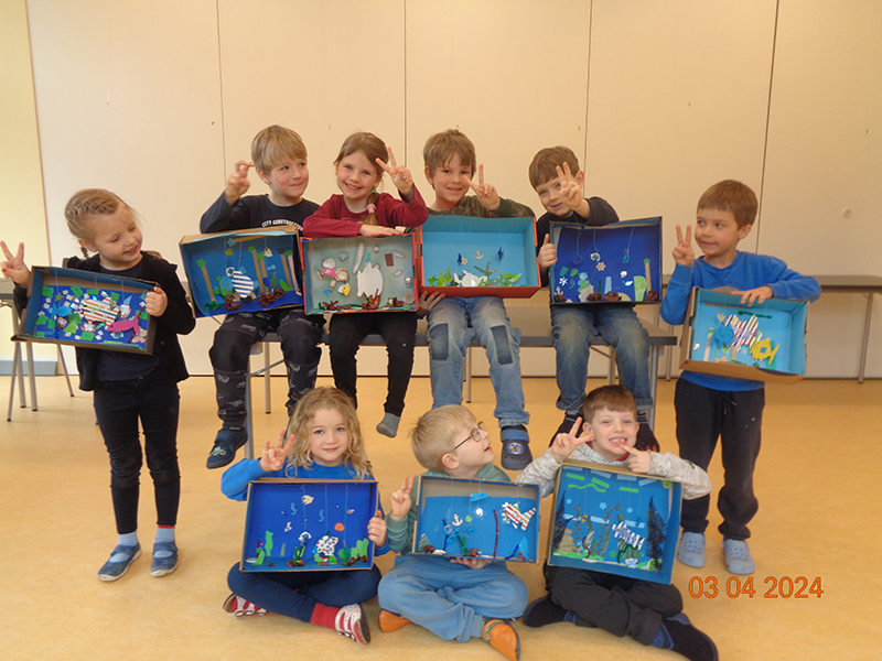 Das bunte Leben im Meer und die spannende Geschichte des Regenbogenfisches konnten unsere Ältesten in den „Leselöwen-Stunden“ phantasiereich darstellen. Ein Schuhkarton wurde zum eigenen Ozean mit bunten Fischen, ungewöhnlichen Wasserpflanzen, Korallenriffen und natürlich mit dem schimmernden Regenbogenfisch. Sozusagen … ein Ozean für die Westentasche.