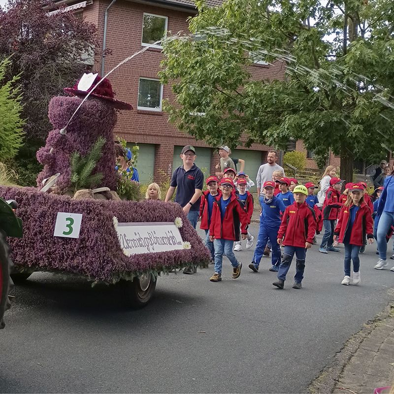 Auch in diesem Jahr war die Kinderfeuerwehr Amelinghausen mit viel Freude und Engagement beim großen Umzug zum Heideblütenfest dabei. Zum zweiten Mal präsentierten wir uns mit einem eigenen Festwagen, der ganz im Zeichen von „Grisu, dem kleinen Drachen“ stand. Passend zu seinem bekannten Spruch „Wenn ich groß bin, werde ich Feuerwehrmann“ haben wir unseren Wagen liebevoll gestaltet und mit viel Heidekraut dekoriert.