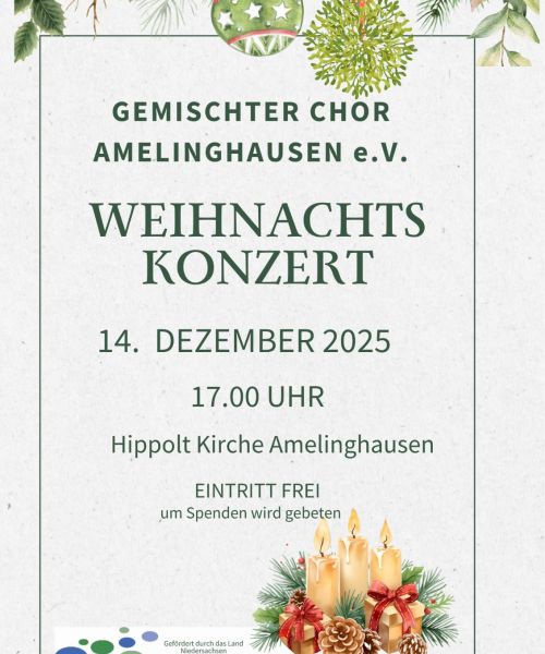 Das Konzert findet am 3. Advent, dem 14.12.2025, in der Hippolitkirche Amelinghausen statt. Beginn ist um 17:00 Uhr. Der Eintritt ist frei, für eine Spende wären wir dankbar.