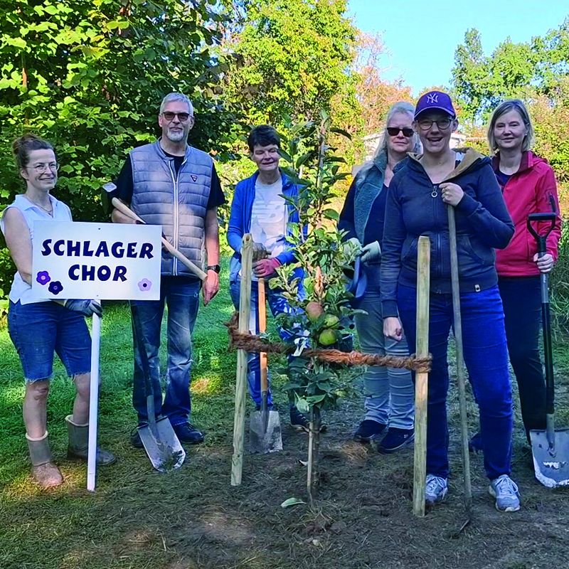 Auch der Schlagerchor wurde bei der aktuellen Challenge „Baumpflanzen“ herausgefordert und hat sich mit dem größten Vergnügen dieser gestellt. Am Samstagmorgen, dem 13.09., trafen sich die Frühaufsteher der Chormitglieder in Betzendorf und pflanzten einen kräftigen Apfelbaum der Sorte Elster. Und wie es im Schlagerchor so ist, haben sich die Beteiligten anschließend zur gemütlichen Frühstücksrunde zusammengesetzt und den Tag, mit der freudigen Aussicht auf herlichen Apfelkuchen, Apfelringe und frisches Obst für frische Stimmen im nächsten Jahr, begrüßt. Möge das Bäumchen fleißig tragen.Selbstverständlich...