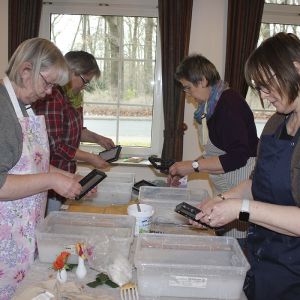 Papier schöpfen ist ein Handwerk, das eine kleine Gruppe kreativer, quirliger Landfrauen mal ausprobieren wollte. Aus der sogenannten Pulpe (eingeweichtes Papier mit Wasser im Mixer püriert), die uns schon von der Kursleiterin Lena fertig mitgebracht wurde, konnten wir wunderbare Papiere kreieren. Mal ganz schlicht, mal mit Gräsern verziert oder mit Samen, das sogenannte Blühpapier. Das kann man z. B. an einen lieben Menschen verschicken, und wenn der möchte, kann er es einfach
