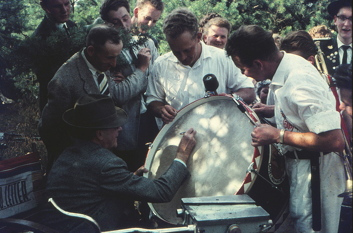 Heinrich Rambachs Pauke bekommt ein Autogramm von Willy Fritsch