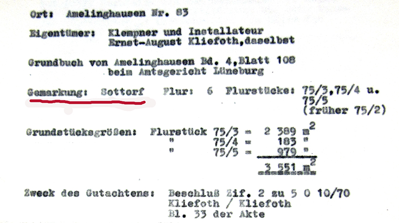 Das Kliefothsche Anwesen schien in der Vergangenheit nicht immer ortsmäßig richtig einzuordnen gewesen sein. Aus den mir zur Verfügung stehenden Akten der Familie geht hervor, dass Briefe mit Sottorf 83 und auch Amelinghauen 83 adressiert waren. In einem Grundbuchauszug aus der Zeit vor der Zusammenlegung der beiden Dörfer ist folgender Vermerk.