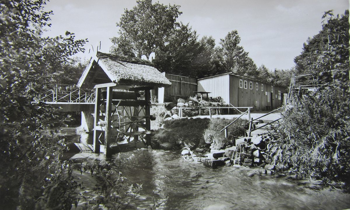 Nach der Badesaison 1955 wurden die Lopauwiesen nicht mehr als Rieselwiesen genutzt. Die Lopau wurde nicht mehr angestaut und der Laufgraben konnte die Badeanstalt nicht mehr mit Wasser versorgen. Die Idee, ein Wasserrad mit Schöpfkellen zu bauen, kam von Schuster Albert Dittmer und Drechsler Hermann Kröger.