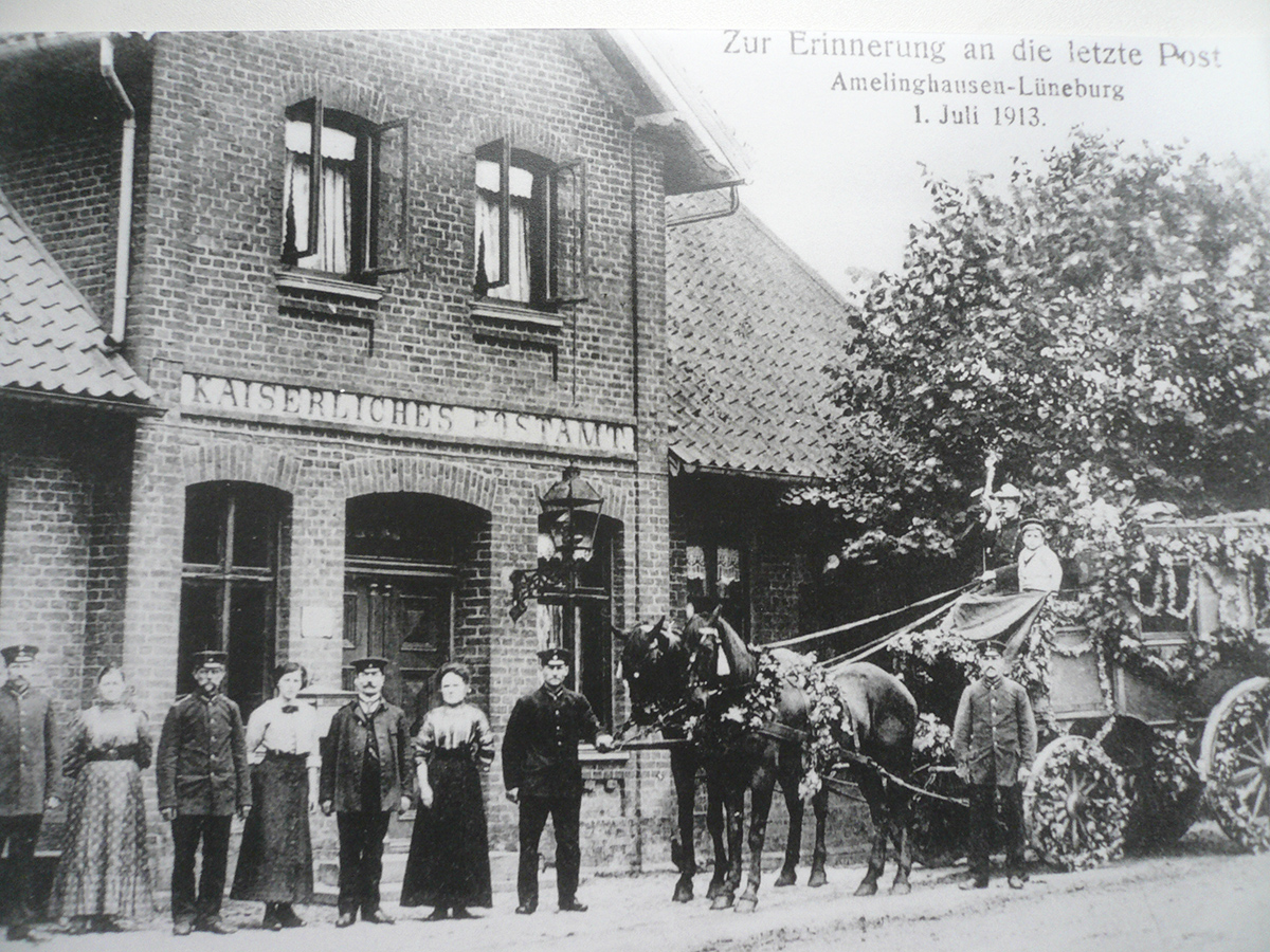 „Die Personenpost, die seit dem Jahre 1866 zwischen Lüneburg und Amelinghausen verkehrte, prankte bei ihrer letzten Fahrt in großartigem Schmucke. Eichenlaub und Kränze von Kornblumen harmonierten vorzüglich mit dem Gelb des Postwagens … Trotzdem er bei der Ankunft daselbst schon auf‘s Prächtigste geschmückt war, ließen es sich ... die jungen Damen aus Amelinghausen nicht nehmen, noch weitere Schmückungen am Wagen und an den Pferden vorzunehmen“, so der Bericht in den Lüneburgschen Anzeigen.