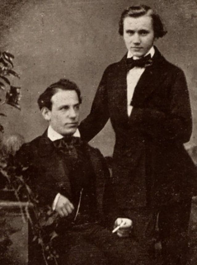Ede Reményi, ungarischer Violinist (1828-1898, links) und Johannes Brahms (1833-1897), deutscher Komponist (Brahms stehend)© Urheber des Bildes unbekannt / gemeinfrei