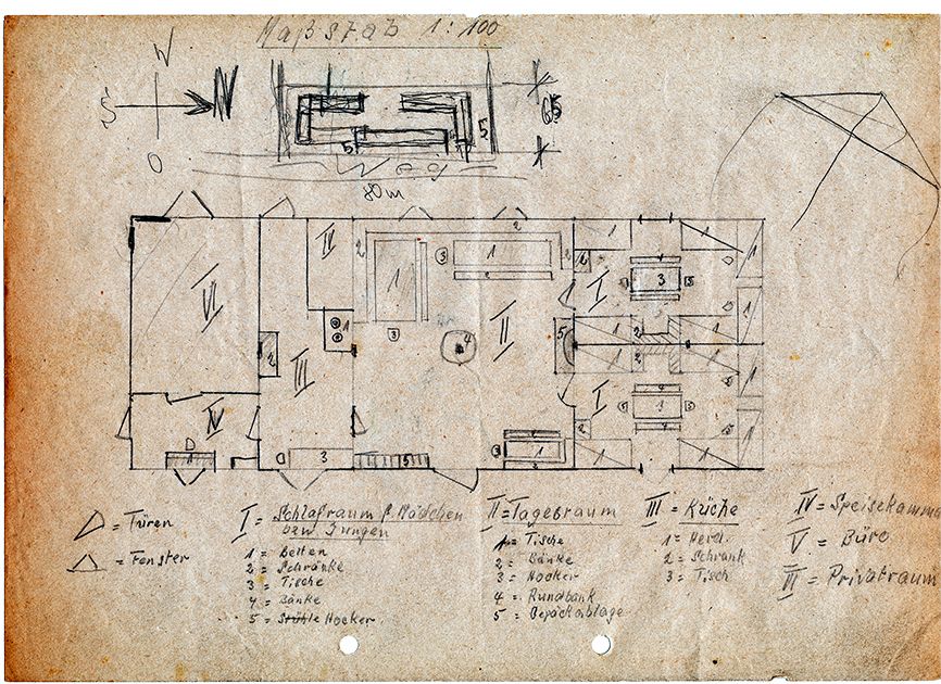 Am 1. September 1946 war die Baracke kaum wieder zu erkennen. Im linken Teil ist der Privatbereich zu sehen, dahinter ein Schlafraum mit 14 Betten und im Mittelteil ein großer Aufenthaltsraum mit einer angrenzenden Küche. Die sanitären Anlagen sind – noch primitiv, aber funktional ausgestattet - in einem kleinen Schuppen.