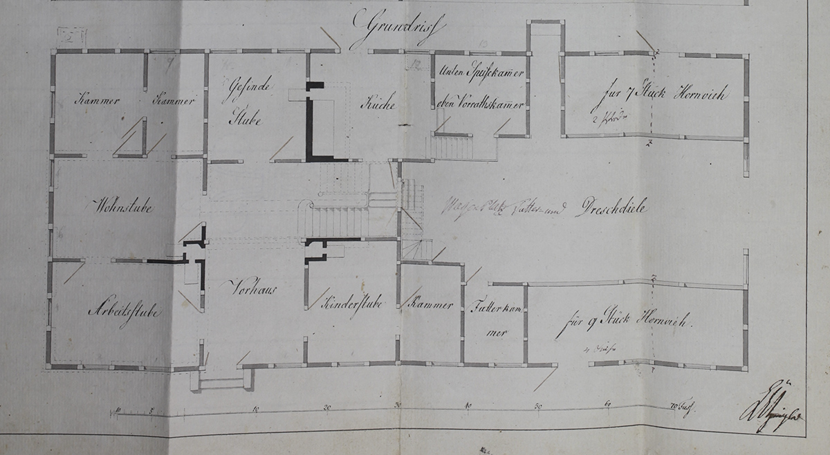 Rechts in der Eingangsdiele befindet sich eine Wendeltreppe zum Obergeschoss: links sind die Schlafräume und rechts ist der Strohboden. Zur Versorgung des Amtsvogtes und seiner Familie mit den Bediensteten gehörte ein 1500 m2 großer Garten (die heutigen Grundstücke im Vogteiweg) und der sogenannte Amtshof mit der großen Zehntscheune, heute im Besitze der Familie Meyer.