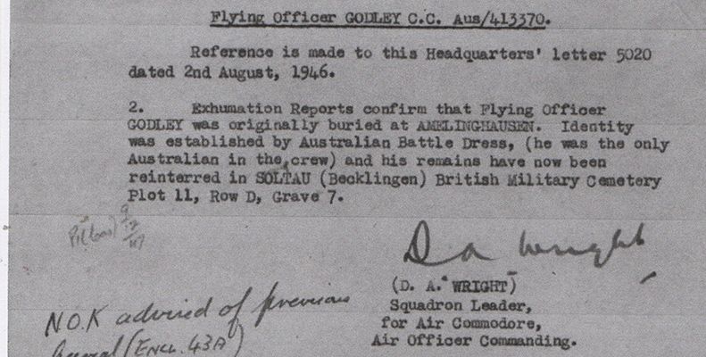 Gemeint ist der australische Flying Officer Godley. Er wurde in Amelinghausen beerdigt und 1947 umgebettet und auf dem Britischen Soldatenfriedhof in Becklingen bei Soltau beigesetzt.