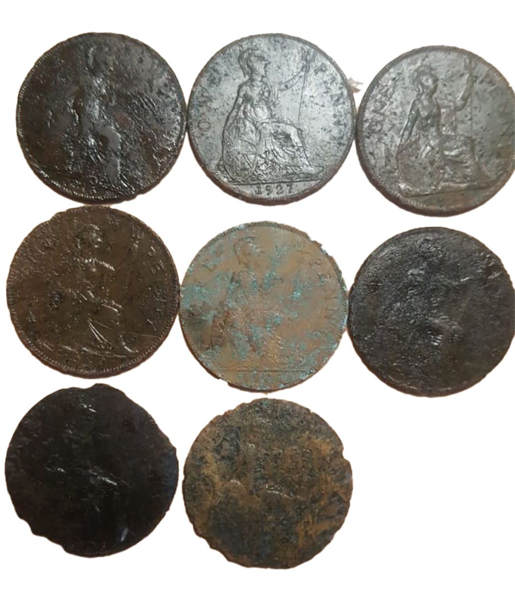 Flugzeugteile und englisches Geld, gefunden mit einem Detektor in 2020 von Achim Baethge
