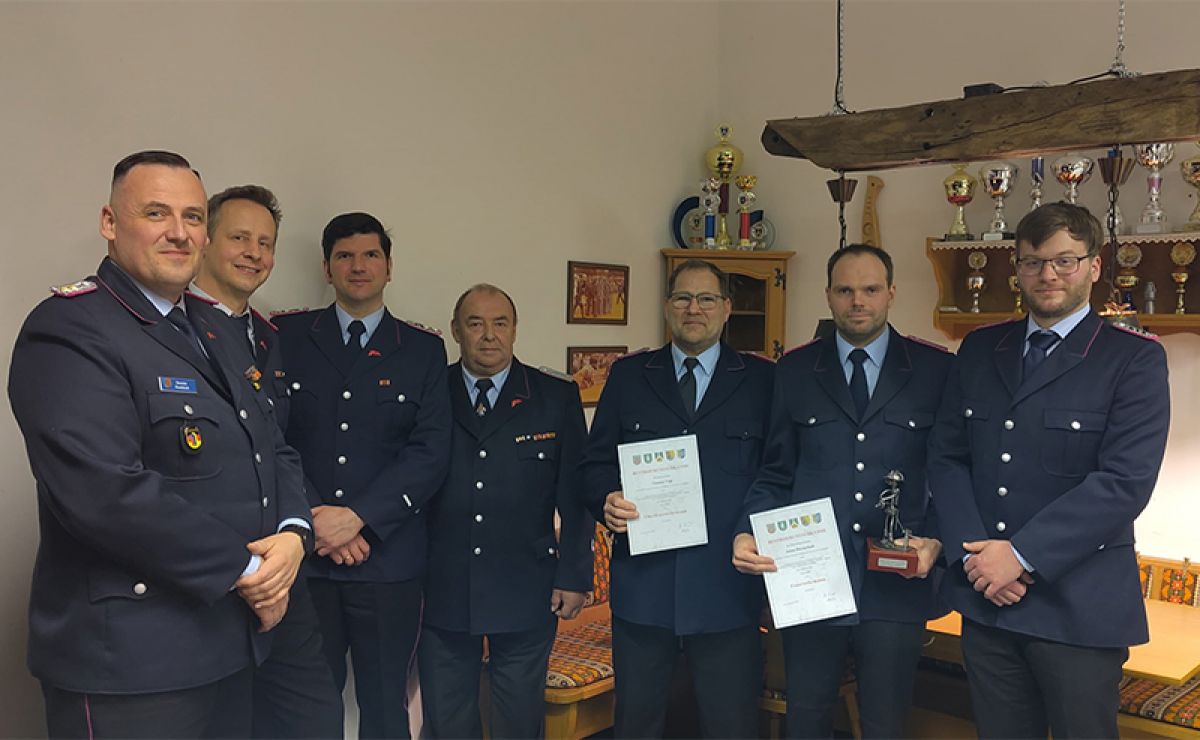 Thomas Vogt wurde zum Oberfeuerwehrmann befördert. Jonas Hornschuh konnte neben seiner Beförderung zum Feuerwehrmann außerdem seine Ernennung zum Feuerwehrmann des Jahres feiern, bei der ein besonders Engagement innerhalb der Wehr gewürdigt wird.