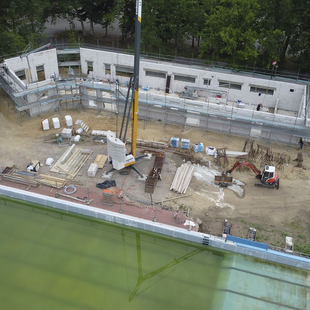 Inzwischen sind viele Leitungen verlegt und das Fundament ist gegossen. Das Außenmauerwerk des neuen Hauptgebäudes steht nahezu vollständig. Damit nimmt der Neubau sichtbar Gestalt an. Als Nächstes steht der Bau der Dachkonstruktion und die Aufbereitung des Mehrzweckbeckens auf dem Plan: Dieses soll zeitnah gereinigt und mit einer speziellen Schutzfarbe versehen werden.