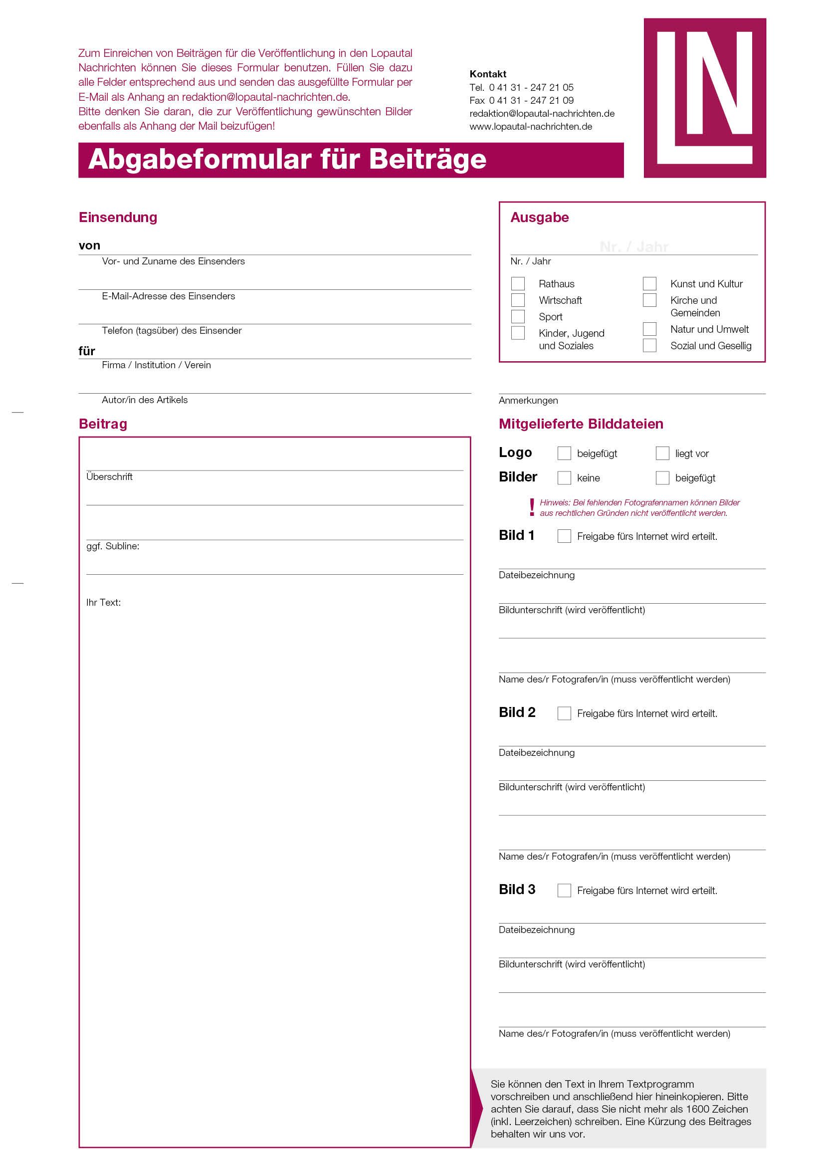 Wenn Sie Bilder von Personen an uns senden, dann benötigen Sie (nicht wir) die Erlaubnis der Personen, die auf dem Bild zu erkennen sind und die des Fotografen, dass das Bild veröffentlicht werden darf. Wir haben Ihnen dazu ein Formular vorbereitet, welches Sie hier downloaden können.