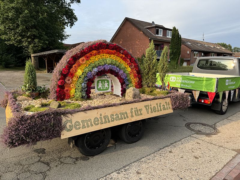 Für diese Werte setzt SOS-Hof Bockum beim Heideblütenfestumzug ein starkes Zeichen mit einem Regenbogen aus bunten Blumen in einer Heidelandschaft. Begleitet wird dieser von einer fast 40köpfigen Fußgruppe, die die Zuschauenden mit Regenbogen-Fähnchen, Gummibärchen und Heidesträußen beschenkt. Belohnt wird das Engagement mit einer Prämierung als 3. Platz in der Kategorie "Nachwuchswagen".